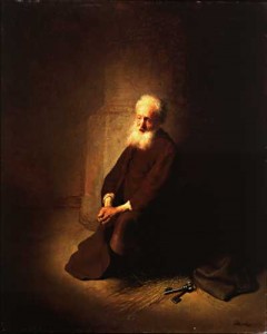 “St. Peter in Prison,” Rembrandt John and I were on our way to pray in the Temple in the afternoon today. The extraordinary events of the last weeks.. .the three thousand who were baptized in His name recently…we felt the enormity of our task demanded that we be in prayer. Nearing the temple, we caught up with a handful of men carrying a lame man, whom we later learned had been that way since birth. His face was not unfamiliar to us. A few of us had stumbled over his legs before, usually while we were trying to keep up with our Lord while He was walking around the Temple. It seemed that we always saw him begging for money, there at the gate whose name did not fit the clients who lay at its doors.